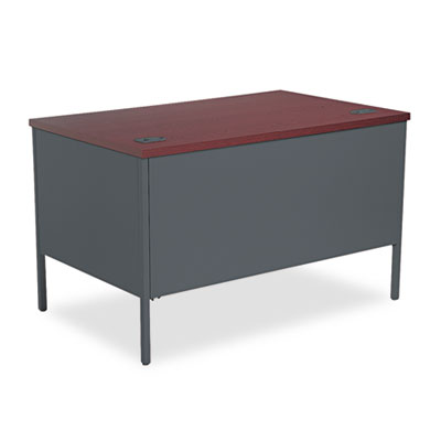Durable, attractively finished laminated top delivers excellent scratch and stain resistance. Color-matched legs, panels drawers and handles tastefully contrast with the top. The high-sided file drawer features full-extension triple-tied cradles and a spring-loaded follower block, while the full-sized box drawer features three-quarter-length tracks and nylon rollers. Universal-lock center drawer allows you to secure all of your drawers with one key turn. Worksurface grommets simplify cable management. Flush side and modesty panels enhance privacy. Color: Mahogany; Charcoal; Pedestal Count: 1; Top Shape: Rectangular.