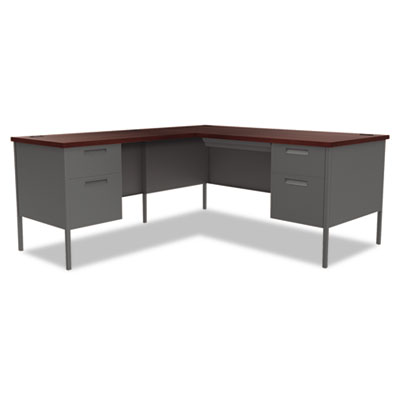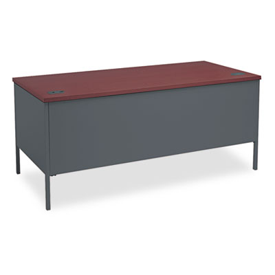 Durable laminate top resists marking. Painted monochromatic legs, flush end panels and drawer pulls. High-sided file drawer with full-extension triple-tied cradles and spring-loaded follower block; box drawer extends three-quarters on nylon rollers. Central locking center drawer with HONŽ "One Key" interchangeable lock cores. Worksurface grommets for cable management. Modesty panel provides privacy. Color: Mahogany; Charcoal; Pedestal Count: 1; Top Shape: Rectangular.