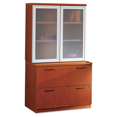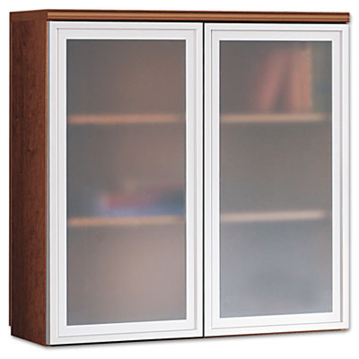 Style and prestige blended with the long-lasting, hard-working attributes of laminate. Easy-care laminate with vertically-matched woodgrain is abrasion- and stain-resistant. Non-locking, frosted glass doors add a touch of elegance. Cord management pass-through gap behind shelves. Grommet in back panel facilitates routing cords and access to electrical outlets. Color: Shaker Cherry; Overall Width: 36"; Overall Depth: 14 3/4".