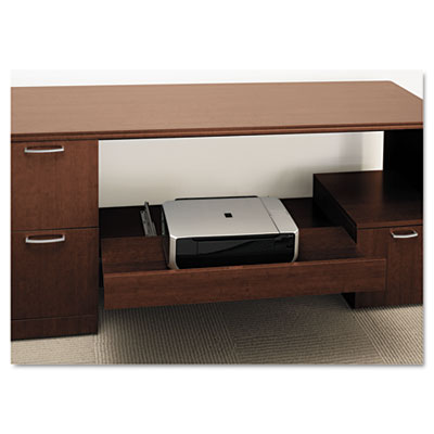 Contemporary designs with enhanced storage solutions and smart technology. Under-credenza storage helps reduce desktop clutter to free up valuable workspace. Durable easy-case laminate with vertically-matched woodgrain is abrasion- and stain-resistant. Includes drawer to store personal items. Color: Shaker Cherry; Overall Width: 54"; Overall Depth: 15 13/16".