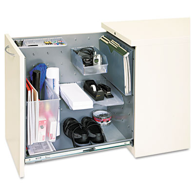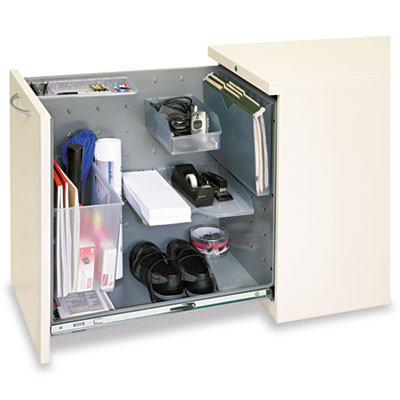 Versatile side-access files feature configurable accessories to fit your specific storage needs. Pantry-style, pull-out drawer offers easy access to contents. Steel ball bearing suspension slides with 100% extension. Fifth wheel is positioned below drawer front for added stability. "One-Key" interchangeable lock core. Includes CD/DVD holder, piling tray, pencil tray and folder bin. Accessories are adjustable in 3" increments. Color: Putty; Overall Width: 15"; Overall Depth: 22 7/8".