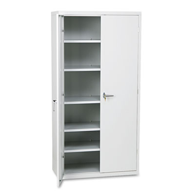 Tough construction provides extreme durability. Reinforced base ensures stability. Shelves adjust in 4" increments to accommodate different sized materials. "One Key" core removable lock allows quick and easy re-keying. Leveling glides adjust for uneven floors. Five adjustable shelves. Color: Light Gray; Overall Width: 36"; Overall Depth: 18 1/4".