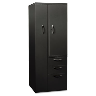 9" wide wardrobe with coat rod. Personal storage cabinet includes two adjustable shelves and wire management grommet. Box/box/file drawers operate on heavy-duty steel ball bearing suspension. Box drawers include divider; file drawer contains follower block and crossrail and accommodates letter and legal size files. Satin chrome arch pulls. HONŽ "One Key" interchangeable core removable locks. Wardrobe on right; storage cabinet and drawers on left. Color: Black; Overall Width: 24"; Overall Depth: 24".