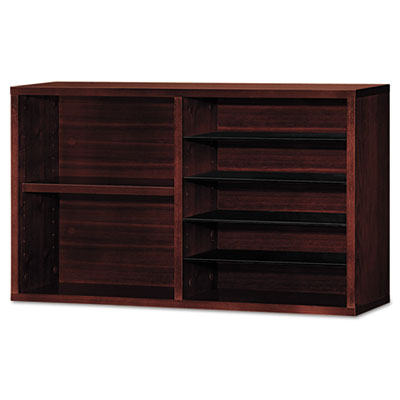 Designed to improve the productivity of busy executives! Ingenious functionality and versatile features. Paper management system helps tame loose papers and stacks of files. Includes five adjustable shelves that can be positioned left and right. Holds letter and legal-sized folders. Stacks onto Announce™ desks and files. Color: Mahogany; Overall Width: 35"; Overall Depth: 9 3/4".