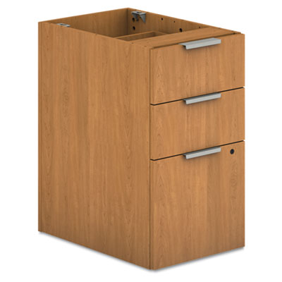 Easy-care laminate resists scratches, stains and spills. Full-extension drawers operate smoothly on ball bearing suspension; file drawer accepts letter- and legal-size hanging folders. Counterweight inhibits tipping when opening more than one drawer. HONŽ "One Key" interchangeable lock core. Adjustable leveling glides help compensate for uneven floors. Not freestanding; use with Rectangular Worksurface. Color: Harvest; Overall Width: 16"; Overall Depth: 20".