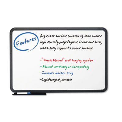 Premium dry-erase board has a ghost-free styrene surface. Features blow-molded body with integral living hinge frame that makes it extremely durable and lightweight. Writing surface is replaceable. Includes hanging hardware and marker tray. Board Type: Dry Erase; Board Width: 48"; Board Height: 36".