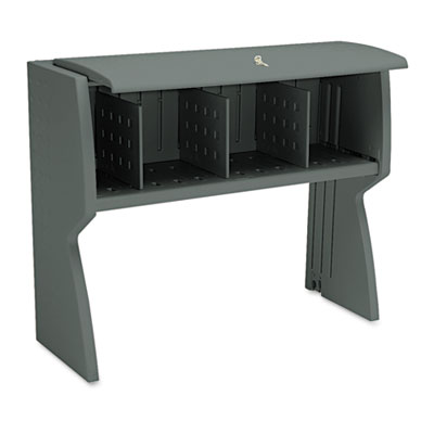 Sturdy, ergonomic hutch is ready when you need it for as long as you need it. Blow-molded, high-density polyethylene is durable and easy to clean; resists scratches, dents and chips. Locking flip-up door for security. 20-1/2" clearance accommodates computer hardware and supplies. Easily assembles and disassembles to meet your changing needs. Color: Charcoal Gray; Overall Width: 43 1/2"; Overall Depth: 16 1/4".