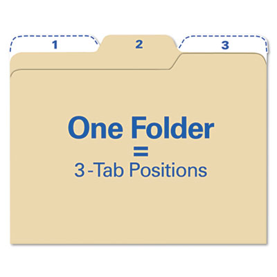 The folder in your hand is always the one you need, because you choose the tab position. Each folder can have any of three tab positions, depending on where you fold it. Choose the tab you want and fold the others down. Scored spine adds flexibility and convenience to your filing. 11 pt. Manila stock. Size: Letter; Folder Material: 11 pt. Manila.