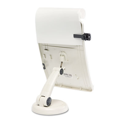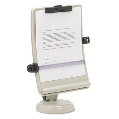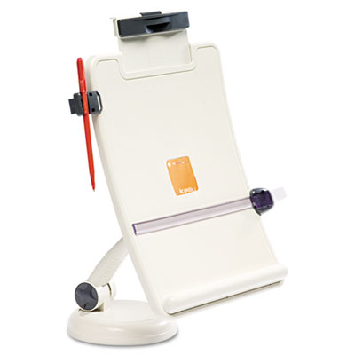 Unique curved tray holds copy in place, reduces overhead glare and improves viewing angles. Weighted base gives great stability. Simple tension knobs easily adjust height, angle and tilt. Smaller side-mounted clip holds stapled documents in place while flipping paper over top of viewing tray. Spring-adjustable, see-through place keeper line guide slightly magnifies text while typing. Spring loaded reversible line guide with slight magnification. Attached pen holder. Holds: Legal; Letter; Mounting: Free Standing; Material(s): Plastic.