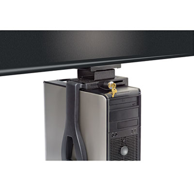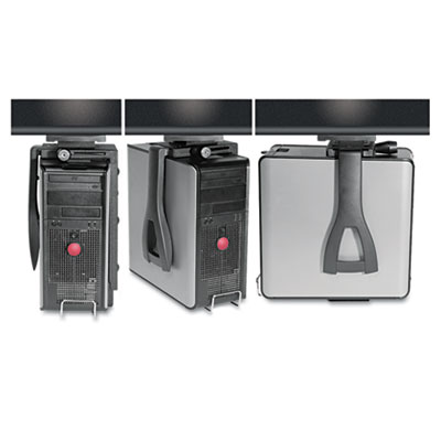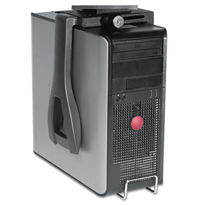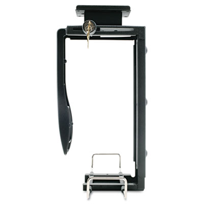 Simple and effective way to get your computer tower off the floor. Easy access to the computer tower with less risk of personal injury due to reaching or bending in unhealthy positions. Features 360° rotation for access to rear panel connections. Mounts vertically, slides on low profile friction free 17” track which stores the CPU under the desk. Heavy duty lock secures the CPU to prevent theft. Includes two keys. Width Range: 3-1/2” to 9-1/3”, Height Range: 12-1/2” to 22-1/2”. Color: Black; Material: Steel.