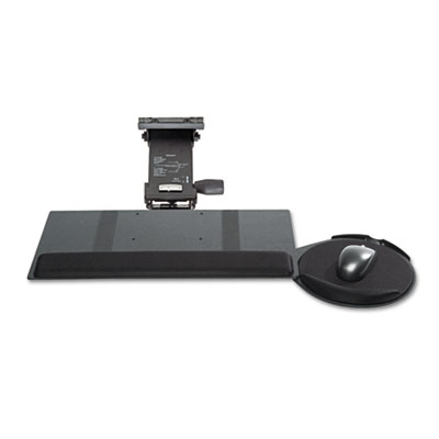 Leverless arm with height adjustable indicator gauge. Easy to view tilt dial with soft touch adjustment knob. 10 degree positive/15 degrees negative tilt. Soft to touch Viscoflux memory foam wrist support and pad. Lift n Lock feature with eight inch vertical height range. Low profile design for optimal leg clearance. Color: Black.