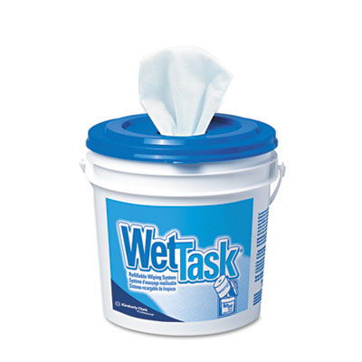 An ideal alternative to using a spray bottle or open bucket with rag. Wipers are specifically designed to be compatible with quat disinfectants and sanitizers. They maintain the target disinfectant concentration and provide a more uniform application than is possible with a cotton rag. Simply add a roll of wipers and your own chemical solution to the WETTASK* disposable bucket with secure lid. Wipers dispense one at a time, preventing cross-contamination of the cleaning solution while reducing exposure to chemical vapors and splashes. Buckets can be prepared ahead of time and are easily transported, allowing you to spot clean germ zones several times a day. Towel/Wipe Type: Wet Wipes; Application: General Purpose; Applicable Material: Glass;Metal;Stainless Steel;Vinyl;Wood.