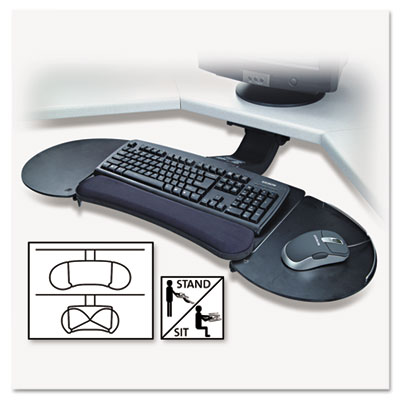 Adjustable height, +/- 15° tilt and 360° swivel. Accommodates sit/stand and corner applications. Soft microfiber wrist rest and dual mouse platforms; mouse pad included. Fits all keyboards, even ergonomic. Workstation Type—Diagonal, Curved, Straight or 90° Corner Glide Track Length—21" Keyboard Tray Dimensions—19 to 24-1/2 wide x 12-1/2 long. Color: Black; Workstation Type: Straight;Curved;90° Corner.