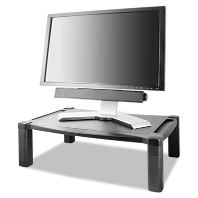 Extra-wide, sturdy platform—designed to better fit the newer widescreen monitors and today's larger laptops. Versatile to accommodate monitors, laptops, printers and fax machines. Can be used to used to store/dock laptop on lower level. Height adjustable from 3" to 6 1/2", in 1 1/4" increments for optimal viewing level. Cable management. Stand Type: Monitor; Width: 20"; Depth: 13 1/4".