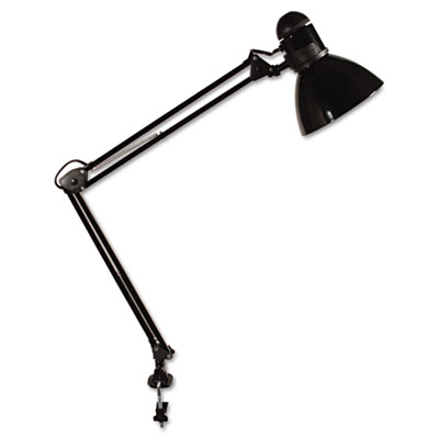 Shed some light wherever it's needed. Multipurpose clamp attaches lamp to any table top. 30" swing arm. Vented shade allows heat to escape to help maintain a comfortable work environment. Bulb sold separately. Base Color: Black; Plug Type: 2 Prong; Height: 34".