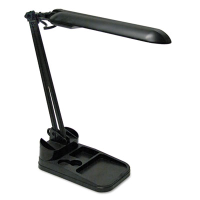 Helps keep your desktop organized. Contemporary style with adjustable swing arm. 8-3/8 x 5 base provides convenient storage space for desk essentials. Base Color: Matte Black; Plug Type: 2 Prong; Height: 17".