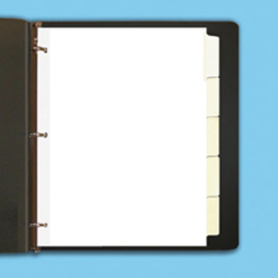 Budget-priced index divider set is fully customizable. Large tabs provide extra labeling space. Reinforced binding edge helps keep dividers properly in place. Tab Style: 5-Tab; Tab Color(s): White; Index Divider Size: 8 1/2 x 11.