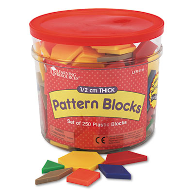 Use this set of 250 plastic blocks in six shapes and six colors to help students explore patterns, symmetry, linear and area measurement, fractions and problem solving. Useful tool for teaching at multiple levels. Blocks are 1/2 cm thick. Teaching guide and storage bucket included. Games/Manipulatives Type: Blocks; Age Recommendation: Grades Pre-K and Up.