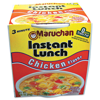Delicious ramen noodle soup mix packaged in a convenient single-serving cup. Just add water, wait three minutes and enjoy. Food Type: Lunch; Flavor: Chicken; Capacity (Weight): 2 1/4 oz.