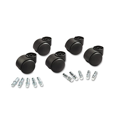 Contemporary design, strength and performance make these replacement casters an excellent choice for office and home furnishings. With appropriate stems and fasteners, each caster can be used on wood, metal and tubular metal chairs, furniture and other equipment. All casters carry the manufacturer's guarantee against defects in material and workmanship. To ensure proper support and safe rolling, neck must fit 1-1/2" diameter chair base so that base and caster fit together as a solid unit. Euro designed 2 3/16" dual wheel casters, for bases with 1-1/2" dia. oversized necks, make the caster and base appear as one. Caster/Glide/Wheel: Dual 2 3/16" Hooded Casters; Color: Matte Black; Stem Type: B; K.