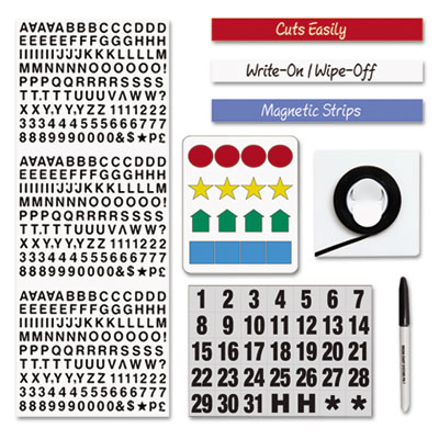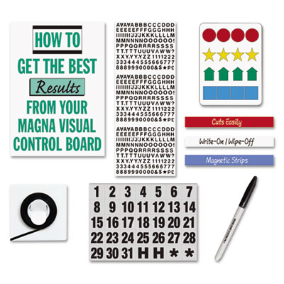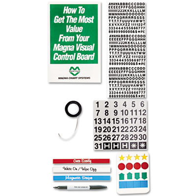 - 3/4" magnetic indicators. Magnetic number set (1-31). 1/8" black chart tape. 1/4" black vinyl letters and numbers. Black water soluble marker. 1/2" x 30" magnetic strips (1 each: Red, White and Blue). 16 page Planning Guide.