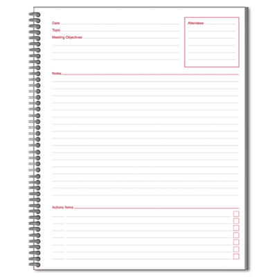 Be ready the next time the boss calls a meeting. Notebook includes sections for meeting attendees, notes and action items. Back of page is lined for additional note space. Linen cover with black wire binding. Premium bond paper provides a quality, no-bleed writing surface. Perforated sheets for easy removal. Pad Type: Notebook; Sheet Size: 11" x 8 1/2"; Ruling: Legal.