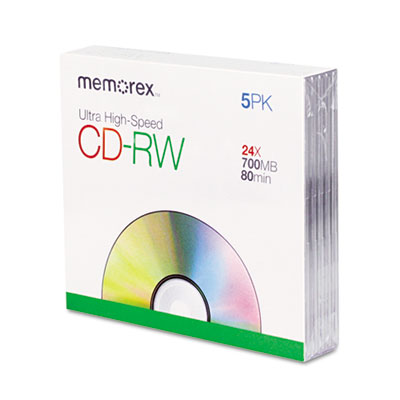 MEM03426 CD-RW Discs, 700MB/80min, 24x, w/Slim Jewel Cases, Silver, 5/Pack By MEMOREX