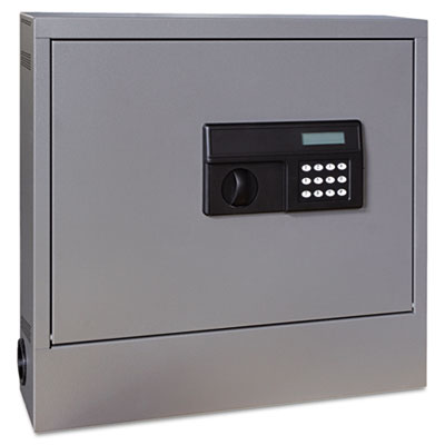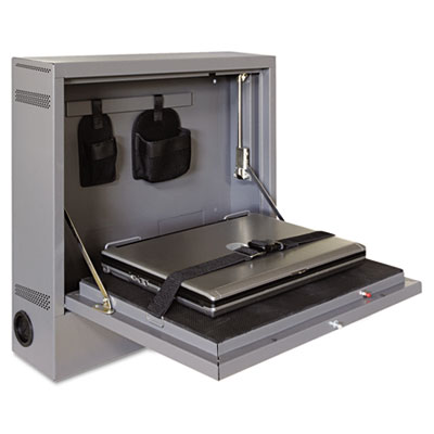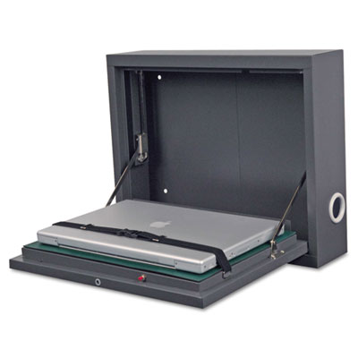 Wall-mounted safe protects laptop computers up to 17 inches. Cabinet holds laptop securely in place. Grommets on both sides permit access by power cords for charging. Keyless access via electronic keypad with changeable administrative and user passwords. Laptop held securely by adjustable straps to cushioned platform that folds out to create a work surface. Includes backup external power source if keypad batteries fail and key access. Outer Width: 20 5/8"; Outer Depth: 5 1/4"; Outer Height: 19 1/2".