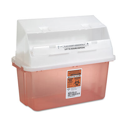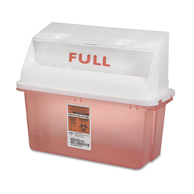 Designed for maximum capacity to fill line and large opening accommodates larger syringes. Translucent lid provides easy-to-see fill levels. Container easily locks for final disposal and safe transport. Waste Receptacle Type: Sharps Container; Material(s): Plastic; Application: Medical Waste.