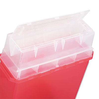 Sharps disposal system. Tortuous lid design limits access to container contents and facilitates one-handed operation. Translucent lid provides easy-to-see fill levels. Large openings accommodate larger syringes. Horizontal drop design for maximum capacity to fill line and large openings accommodate larger syringes. Containers easily lock for final disposal and safe transport. The nestable design saves money on shipping costs and storage space. Waste Receptacle Type: Sharps Container; Material(s): Plastic; Application: Medical Waste.