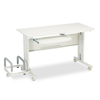 Pull-out keyboard shelf with wrist rest that flips up to reveal pencil storage. Table top curves forward for comfortable mousing. Overall dimensions include the CPU holder. Color: Gray; Overall Width: 52"; Overall Depth: 23 1/2".