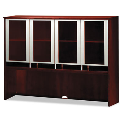 Combines clean, modern lines with a wide selection of storage options. AA-grade select wood veneer with 14-step finishing process. See-thru doors provide a professional appearance. Shelves adjust to meet your specific needs. Open storage compartments for quick and easy access to contents. Brushed silver finish adds flair and style to any office environment. Ships assembled so valuable time is not wasted putting it together. Color: Sierra Cherry; Overall Width: 72"; Overall Depth: 15".