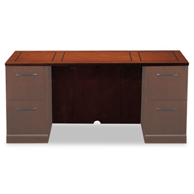 A transitional line of furniture ideal for the executive office. Multiple species of AA-grade North American hardwood veneer combine to create an elegant, sophisticated look. Rich cherry veneer borders distinctive walnut inlays and bird's-eye maple panels. Full-height modesty panel for privacy. Not freestanding. Credenza Top, Desk Legs and/or File Pedestals sold and shipped separately—ORDER ALL THREE. Color: Bourbon Cherry; Overall Width: 72"; Overall Depth: 24".
