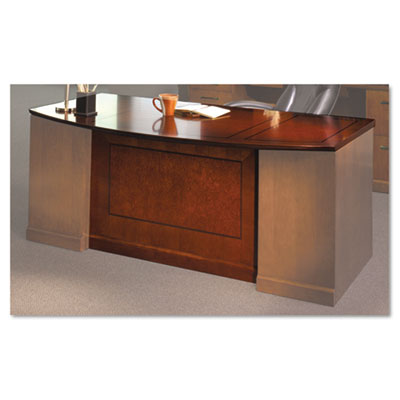 A transitional line of furniture ideal for the executive office. AA-grade North American hardwood veneers throughout. Rich cherry veneers surround distinctive walnut inlays and bird's-eye maple panels. Full-height modesty panel for privacy. Not freestanding. Requires Desk Legs and/or File Pedestals sold and shipped separately—ORDER ALL THREE. Color: Bourbon Cherry; Top Shape: Bow Front.