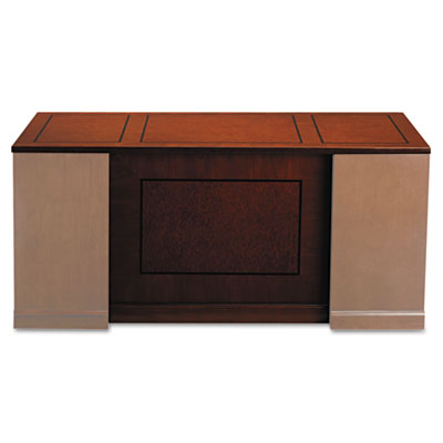 A transitional line of furniture ideal for the executive office. AA-grade North American hardwood veneers throughout. Rich cherry veneers surround distinctive walnut inlays and bird's-eye maple panels. Full-height modesty panel for privacy. Not freestanding. Requires Desk Legs and/or File Pedestals sold and shipped separately—ORDER ALL THREE. Color: Bourbon Cherry; Top Shape: Rectangular.