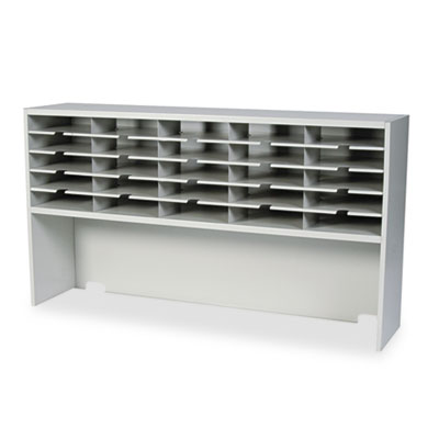 Mailroom sorter features large 11 5/8w x 13 1/4d x 2 5/8h compartments that easily accommodate mail volume. Compartment "thumb cuts" speed mail retrieval. Rugged steel construction stands up to the wear and tear of a busy mailroom. Literature Sorter Type: Open Front Mail; Number of Compartments: 25; Compartment Size: 13 1/4" x 2 5/8" x 11 5/8".
