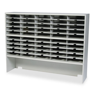 Mailroom sorter features large 11 5/8w x 13 1/4d x 2 5/8h compartments that easily accommodate mail volume. Compartment "thumb cuts" speed mail retrieval. Rugged steel construction stands up to the wear and tear of a busy mailroom. Literature Sorter Type: Open Front Mail; Number of Compartments: 50; Compartment Size: 13 1/4" x 2 5/8" x 11 5/8".