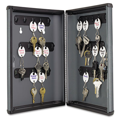 Contemporary designed durable steel construction hook–style key cabinets are engineered to safely store and secure keys. Included key tags have label windows for easy viewing and are color-coded to simplify key organization. Predrilled holes allow for hanging on wall or attachment to partition hangers (screws included). Secure cam lock with two keys included. Key Capacity: 30; Material(s): Steel; Color(s): Charcoal Gray.
