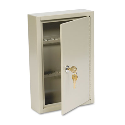 Features quality, welded-steel construction with paracentric security lock and two keys. Comes with numbered key tags and lock location charts. Keys attach to numbered tags (included) and are stored on rack slots for easy identification. When a key is loaned or issued, an "Out Key" control tag recording key number, key recipient and date can be filled out. Piano-hinged door opens and closes easily. Key Capacity: 40; Material(s): Steel; Color(s): Sand.