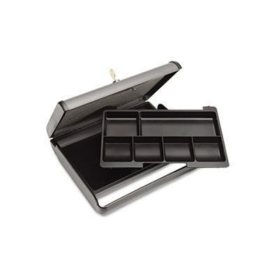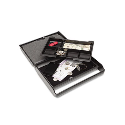 Contemporary design engineered for safe storage of currency and irreplaceable valuables. Durable metal construction and soft velvet bottom liner protect valuables. Includes removable standard cash tray and coin compartment to prevent coin tray from moving during transportation. Features key lock and two keys. Retractable handle for easy carrying.