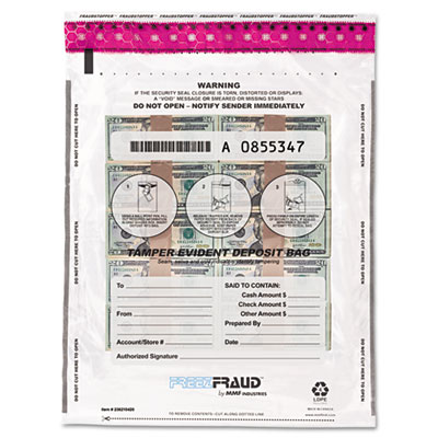 Easy, accurate and economical way to ensure safe deposits. Security closure features seam, saliva and cold tamper indicating graphics. Made from recyclable film plastic. Bags are tear and water resistant. Bottom edge is folded for additional security. Alphanumeric bar code provides audit trail. Width: 12"; Color(s): Clear.
