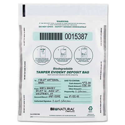 Eco-friendly bags feature a property additive that allows microorganisms to break down plastic in landfills, making bags biodegradable. Security closure features seam and void indicating graphics. Made from recyclable film plastic. Bags are tear and water resistant. Bottom edge is folded for increased security. Alphanumeric bar coding provides audit trail. Width: 9"; Color(s): White.