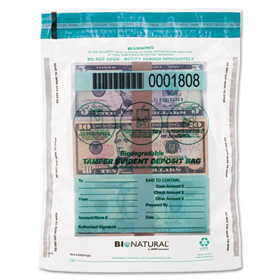 Eco-friendly bags feature a property additive that allows microorganisms to break down plastic in landfills, making bags biodegradable. Security closure features seam and void indicating graphics. Made from recyclable film plastic. Bags are tear and water resistant. Bottom edge is folded for increased security. Alphanumeric bar coding provides audit trail. Width: 9"; Color(s): Clear.