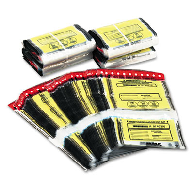 Self-sealing adhesive closure has security features that exceed bank requirements for levels of tampering evidence. Security seal will display "VOID" message and rip if exposed to extreme cold. Blue dots will appear on security seal when exposed to heat. Stars on seal distort if bag is exposed to chemicals, solvents or saliva. Microprint fades and distorts if seams are broken and resealed. Alphanumeric coding, bar code and tear-off receipt provide audit tracking. Top pouch holds currency, while bottom pouch holds checks and deposit slips. Width: 9 1/2"; Color(s): Clear.