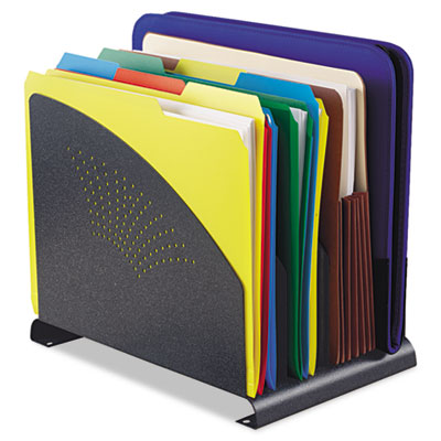 Adds elegance to any office décor! A great organizer for holding binders, files, mail, papers and reports. Constructed of heavy-gauge steel to provide maximum strength and stability, this organizer is coated in granite with a scratch and chip-resistant finish, the non-slip, non-mar padded bottom provides a scratch-free, secure grip. Desktop File Folder Sorter Type: Vertical File Sorter; Number of Compartments: 4; Material(s): Steel.