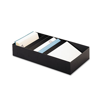 All-steel construction with scratch-and-chip-resistant finish stands up to years of punishing use. Includes separate sections for #10 envelopes, notepads and other supplies (supplies sold separately). Keeps all-important stationary supplies organized in a single, easily accessible location—perfect for busy professionals who need stationary and envelopes at their fingertips. Fits in most desk drawers for added convenience. Compartments: 5; Adjustable: No; Height: 3 3/4".