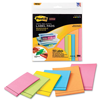 Write, peel and stick! Compact, easy-to-use pads allow for quick labeling. Full-adhesive back with perforated tab. Labels stick securely and remove easily. Great for organizing binders, shelves, containers and much more. Label Size - text: 1 7/8 x 2 7/8; 2 7/8 x 2 7/8; 2 7/8 x 4 5/8; Label Color(s): Assorted.