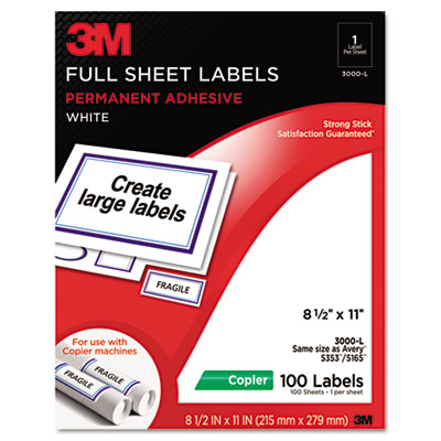 MMM3000L Permanent Adhesive White Full Sheet Copier Labels, 8-1/2 x 11, 100 Labels/Pack By 3M/COMMERCIAL TAPE DIV.