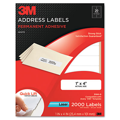 MMM3100D Permanent Adhesive White Laser Mailing Labels, 1 x 4, 2000/Pack By 3M/COMMERCIAL TAPE DIV.