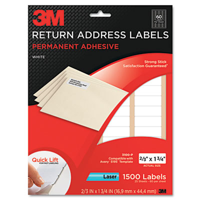 MMM3100P Permanent Adhesive White Mailing Labels f/ Laser Printers, 2/3 x 1-3/4, 1500/PK By 3M/COMMERCIAL TAPE DIV.